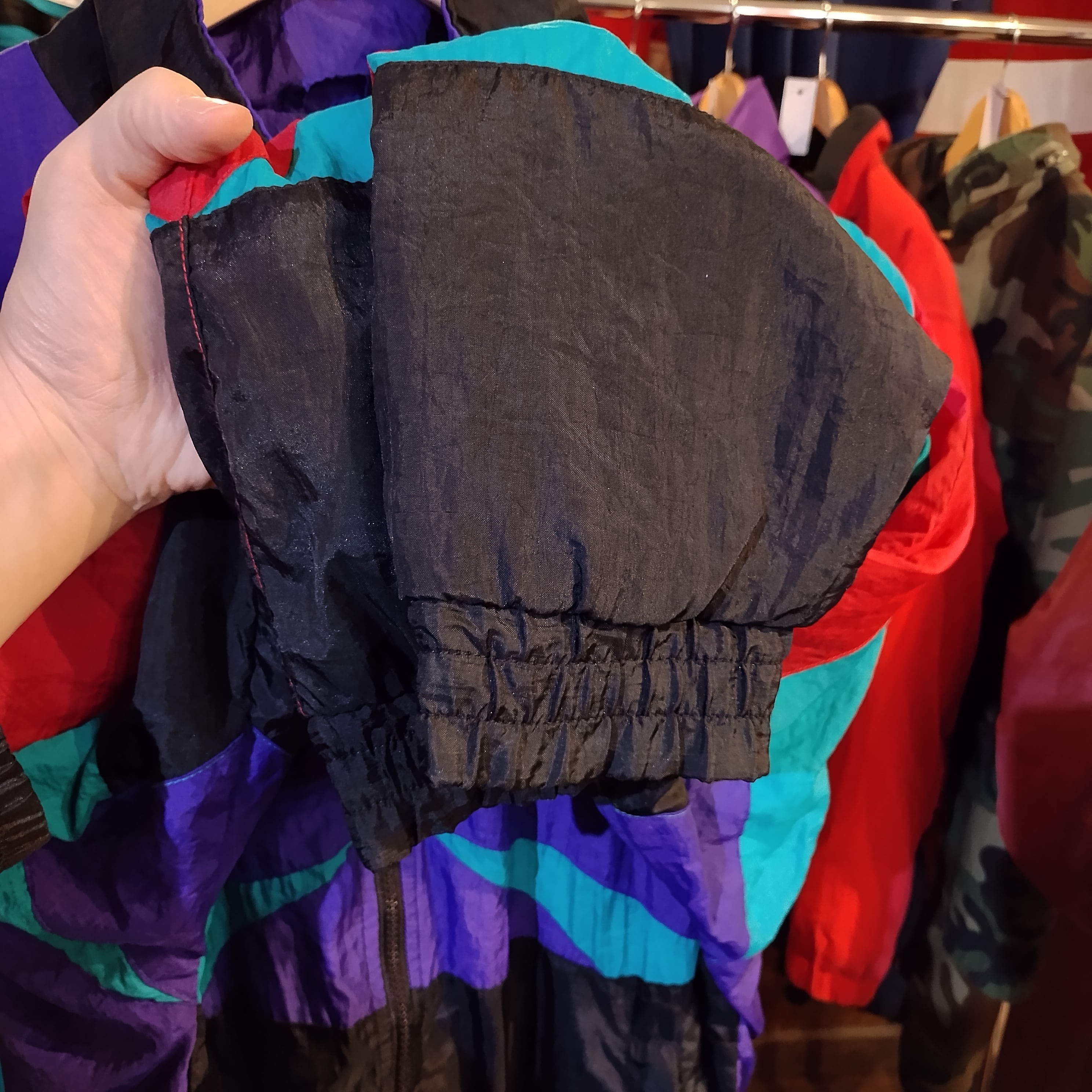 Used ナイロンジャケット◆小さめ 90s Athletic レトロ マルチカラー ジャケット ブラック◆USA古着 アメリカン